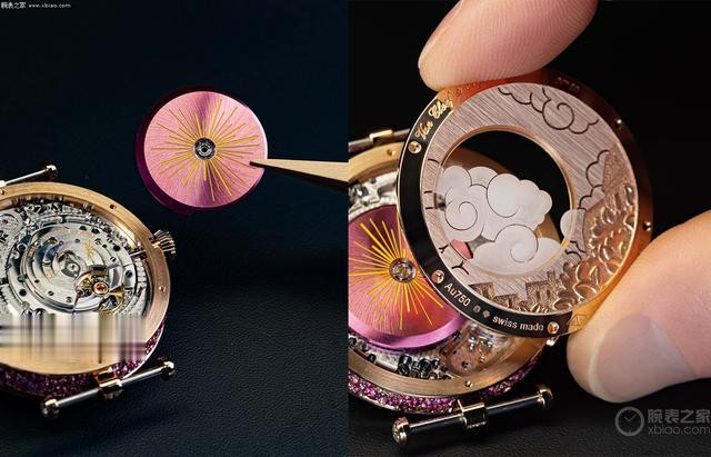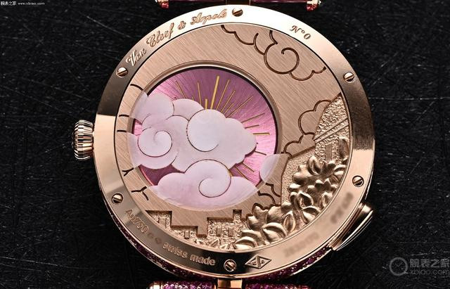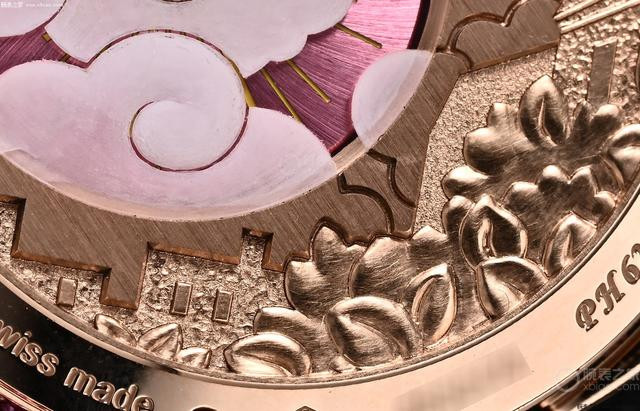 全新“四时版”情人桥腕表依然保持不透底设计,这是因为,情人桥的故事在表背还在继续。粉色圆形摆陀以黄色太阳纹装饰,呼应“拂晓”主题。蓝宝石玻璃上的白云也在“拂晓”中镶上了一层金边。玫瑰金底盖上,城市、花卉与云朵图案全部由雕刻大师手工雕刻。