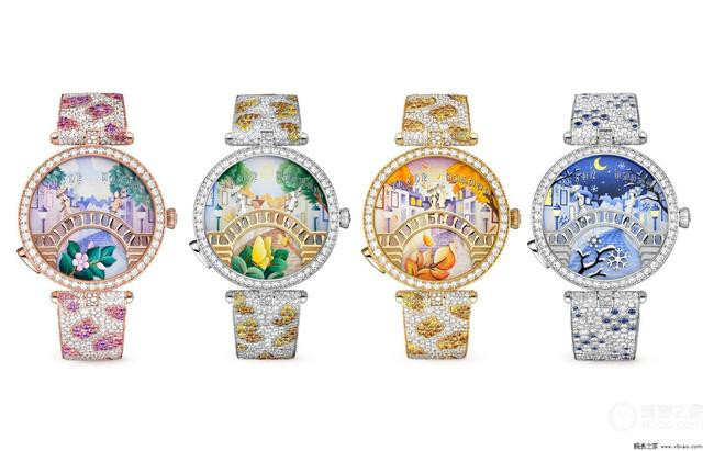 自诞生至今的十多年来,“情人桥”腕表已经成为梵克雅宝的明星作品。发生在情人桥上的浪漫故事,也有“日间”、“夜间”、“四季”不同的版本。今年,情人桥上又有新故事发生了,梵克雅宝推出全新“四时版”Lady Arpels Pont des Amoureux “情人桥”腕表——四款腕表换上珍贵的珠宝表带,演绎恋人一天四时的浪漫约会,在表盘上描绘出拂晓、早晨、夕阳和月夜的浪漫场景。