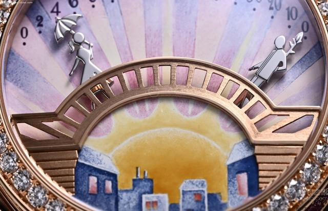著名的“情人桥”置于珐琅盘的上层,使用玫瑰金,似乎是被“拂晓”天光染成的金色。桥体经过镂空设计,形成一种透视效果,金质桥体经过水平拉丝和抛光交替处理。桥墩则以磨砂面装饰。不同打磨修饰为“情人桥”增加了独特的质感,突出立体层次。