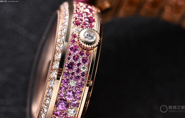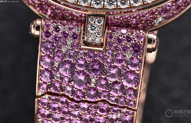 全新Lady Arpels Pont des Amoureux Aube(拂晓)腕表使用玫瑰金材质,直径38毫米。可以看到,表壳经过抛光处理,表圈、表耳、表冠以钻石装饰。表壳侧面、表链上则密镶了大量的粉色蓝宝石与钻石。这些宝石大小不一、色调也有所不同,组合排列后呈现出渐变效果,非常华丽。