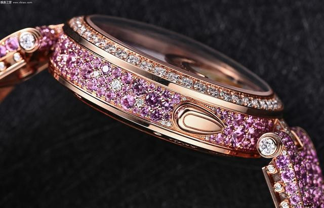 作为传统钻石镶嵌方式之一,密镶得以让钻石或宝石之间紧密相连,尽可能减少宝石之间的空隙,从视觉上看,金属底座“消失”,最大程度展示出钻石火彩和宝石的光泽,大幅度增添腕表的奢华效果。
