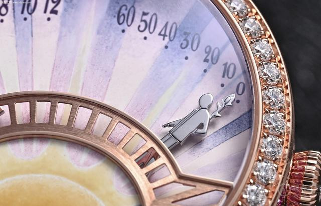 Lady Arpels Pont des Amoureux Aube(拂晓)腕表通过“彩色墨彩珐琅”工艺打造表盘。16世纪,法国中南部城市利摩日发展起来的一项珐琅技术“墨彩珐琅”,通过两种颜色珐琅的相互作用,由此产生的双色明暗对比效果,赋予表盘丰富的层次感。梵克雅宝将这项技术与彩色珐琅结合,在腕表表盘上加入蓝色、粉色、黄色、橙色等珐琅釉料,经过绘制与烧制,硅粉和颜料在窑炉中相互作用,最终在表盘上呈现出精致柔和的拂晓景象。视觉上看,整个表盘就像一幅水粉画,颜色非常细腻、明艳。